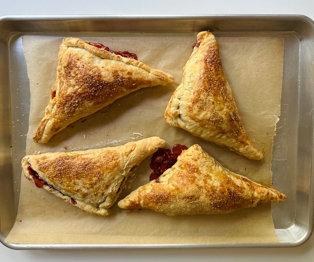 Look at these luscious morsels. Full of tart cherries (just like cherry pie). I was really wanting something cherry but didn’t want to make a pie (therefore eat a pie), so we made cherry turnovers.