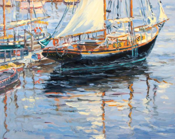 Wiscasset. LOVE that little town… “Maine’s prettiest Village” also has a pretty fantastic gallery, Wiscasset Bay Gallery. Keith Oehmig, the guy who established Wiscasset Bay Gallery, just happens to be a fabulous artist as well as a really nice guy. The kind of guy you WANT to buy a painting from. The piece above is entitled “Camden Waterfront” (oil on board/24×30) is an excellent representation of his work, AND while I already had him scheduled to be a post on this blog, an art card arrived in the mail with this very painting on it! Whoa…! It’s wonderful receiving those cards, and THANK YOU to the galleries who still send them. I have a bulletin board full of artists that we would like to collect from one day… This card is now going on my bulletin board!