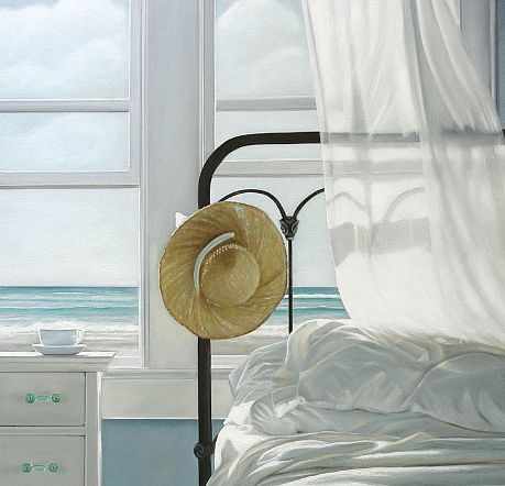 I can FEEL the breeze blowing in the window, I can hear the crashing of the ocean waves, the birds chirping… I can smell the salt air, I FEEL AS IF I AM THERE. Ahhh, this is a great painting done by an amazing artist from Atlanta, GA. She is known for her light airy paintings and considers a painting successful if the viewer feels as if they’re there. Here’e a blip from the artists website: