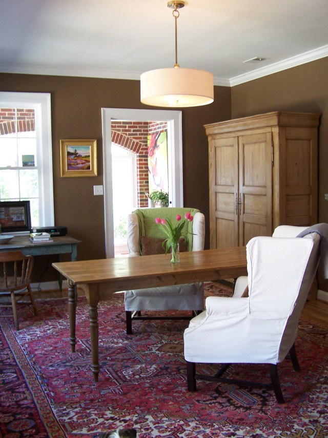 Isn’t this a gorgeous light? We have fought with ourselves over which chandelier to use for, well… years. So until we could make up our minds for sure we hung a ceiling fan which served its purpose in the interim. The Reed Hanging Light is one classy light, simple and elegant, not fussy in design. We ordered the hand rubbed antique brass finish with the natural paper shade which we LOVE. There is nothing like a shade from Circa Lighting. It gives off the most eloquent warm light. It makes every room look positively radiant! There is a diffuser on this fixture so you aren’t blinded by bright light. We also have it on a dimmer so it can be as bright or as romantic as you would like… If you’re searching for a fantastic light fixture, check this one out! Our house is an older house (1930’s), our furniture is a mix of antiques (mostly pine), and new (mostly slipcovered) furniture. So we have an updated look, with more modern lighting. This was perfect. Remember, you can always order from Circa Lighting online. If you’re in the Charleston, SC area stop in and see Matthew McLaughlin, the manager. He’s a very cool dude who knows EVERYTHING about lighting. Remember, you can order online and it’s FREE SHIPPING (in most cases), and you only pay tax if you’re located in one of the three states they’re in (SC, GA and TX). Lots of good reasons to order from Circa Lighting! Nice to know you don’t have to be near a store to take advantage of their beautiful lighting!