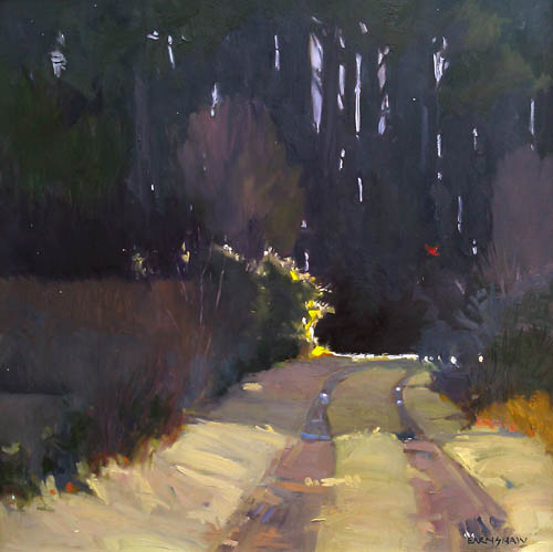 I absolutely love it when I run across a painting that just takes my breath away… this is one sweet painting. Fred and I were at the art walk in Charleston, SC a few weeks ago and we went in the Horton Hayes Gallery (if you haven’t been you MUST go, so many fabulous artists in one space!). Lovely work, I’m telling you, Mark Horton, Chris Groves, Nancy Hoerter, Shannon Runquist, Larry Moore, (and more) all so very talented. Then we went upstairs (if you don’t normally go upstairs it’s quite the treat, there are a treasure of beautiful paintings upstairs as well) we saw this painting “One Mile To Go” on an easel. The way the light hits the foliage, the light in the trees and WHOA that tiny red bird across from the bright sun on the bushes… brilliant! Adele Earnshaw is a very impressive artist… here is a blip from the Horton Hayes website: