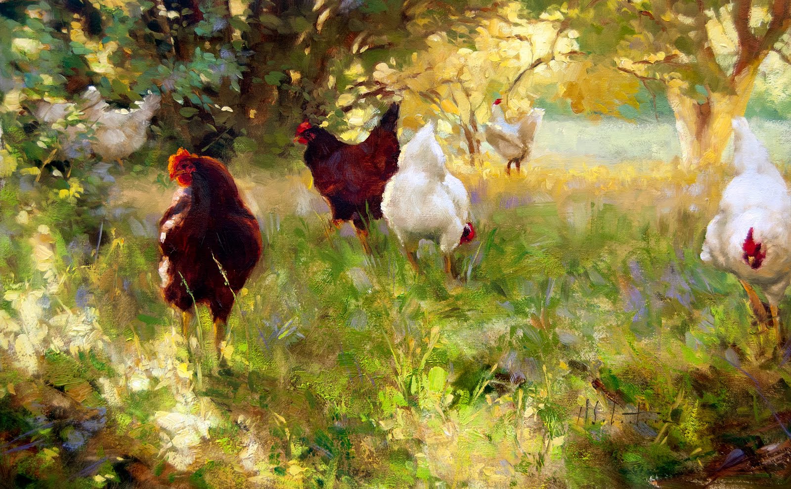 I saw a magnificent still life on Facebook that Mara had done. Whoa! I scooted right over to her site to check out her work. Nothing short of impressive. I love the “Backyard Chickens” painting. The dark chicken right next to the white chicken really makes them both pop out at you. What caught my eye that I really loved was the sunlight hitting the one dark chicken. The areas of sun form a nice little path that keeps your eye nicely in the painting. I guess it’s no surprise that this painting was one of the Top 50 finalist in the America China Oil Painting Artists League 2011 realist painting competition! Great job Mara! If you get a second, check out her site, her paintings are fantastic and she gives you a step by step on many of her paintings on her blog. So amazing!