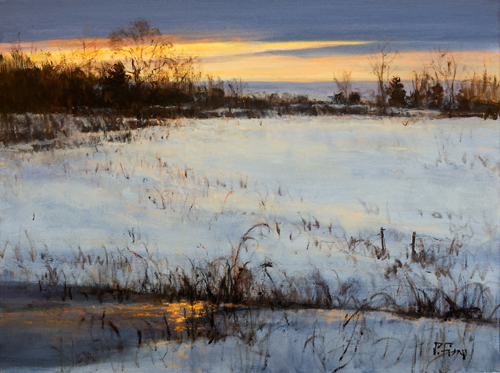 I love paintings depicting light… always have. The colors are so vibrant in this painting. Even though its cold out, you can feel the sun hit your back as you face the tree… nice and warm, (now if that warmth could reach down to your feet, right?)! This is a great moody piece. To me it looks as if the snow arrived early, while there is still a little color left in the trees. There are a few nuances that I think make this painting… the subtle thin reddish orange twigs/branches towards the bottom on the right as well as around the sun spot. It grabs my attention. Way to go Peter!