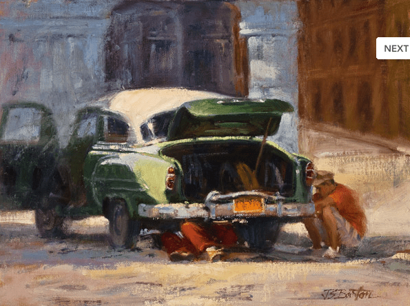 I think this is an incredible painting. Obviously the white box with the word “NEXT” that you see on the image is the only way I could retrieve it. It’s not part of the painting… ha ha. I love the colors, textures and light in the foreground, and the looseness of the background. The car and the people… fabulous. Such a cool old car with the light hitting it oh-so-perfectly! Very nice. And I have to say… I LOVE, LOVE, LOVE the license plate… that little blip of orange, WHOA! This piece was one of the juried pieces in the American Impressionist Society (AIS) Exhibition. Very nice work by Jane… check out her work!
