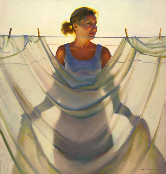 Isn’t this fabulous? You can just feel that sun beating down, can’t you? The light is fabulous! I love how you can see the shadow of her figure through the sheet. Jeff is a more detail oriented artist with some very nice and unique paintings! I see that Jeff also shows at Helena Fox Fine Art gallery here in Charleston, SC – small world!