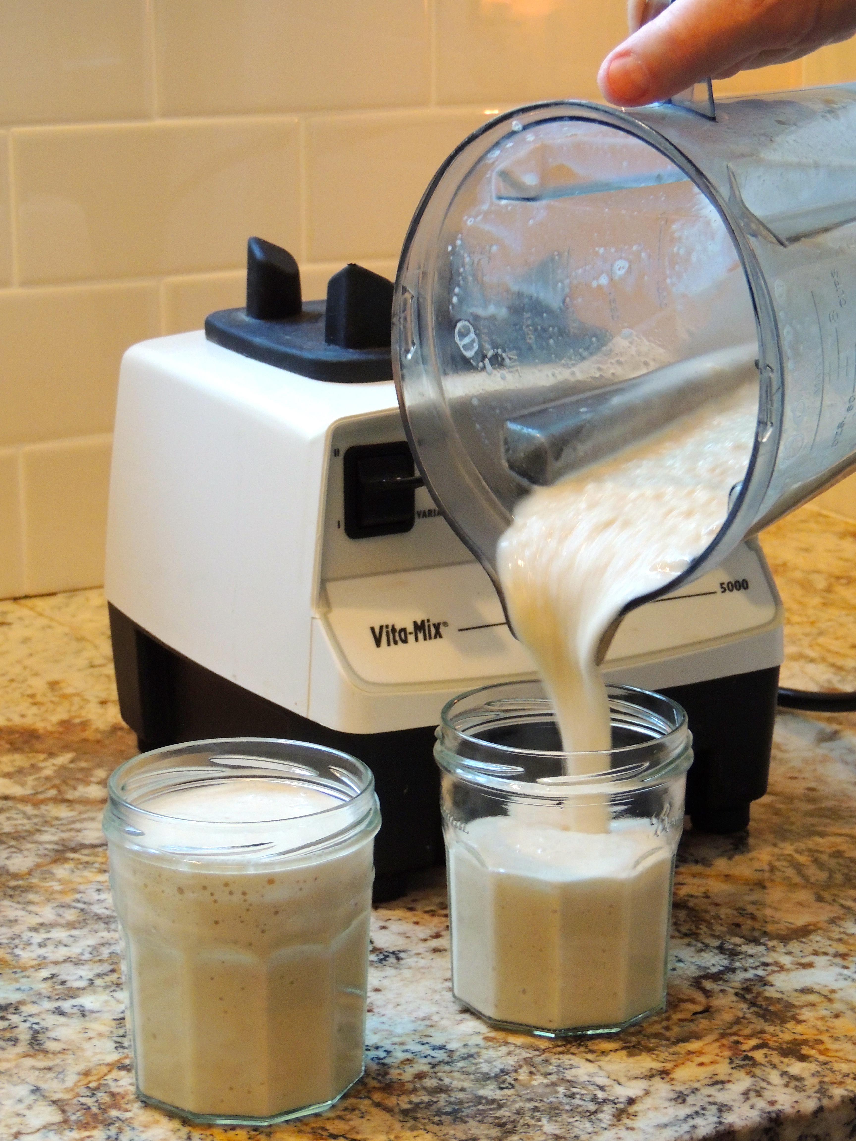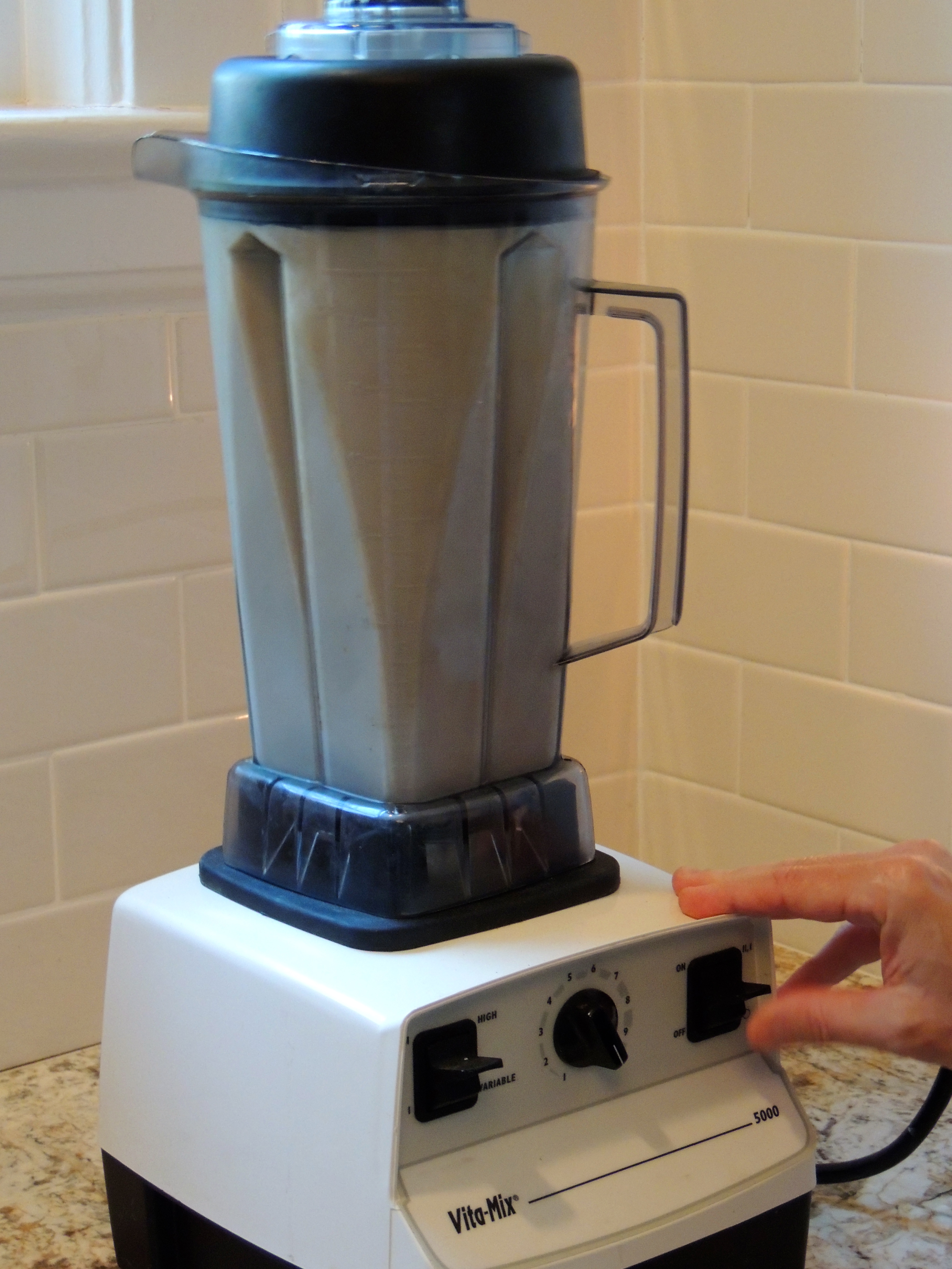Now add about 2 cups (give or take) of almond milk. (Note: You can also use soy milk… it’s poison to me so I can’t drink it, but long ago I used to use vanilla soy. Almond milk is much better).