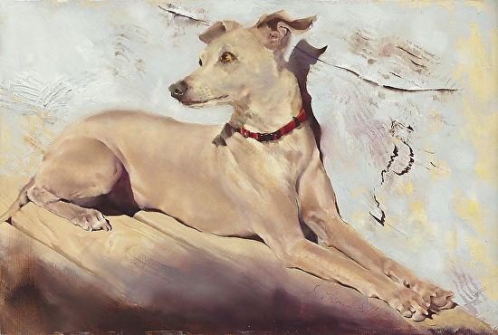 Meet Dean Buhler’s dog, Gustovio! Dean captured this dog so perfectly. These are such elegant animals, and you can see that in this painting. What a fabulous background! The very realistic dog against the abstract background … love it! The colors in the wall really makes Gustavio stand out! Take a minute to look through Dean’s website. Breathtaking paintings, one after another. Whoa! This painting by Dean was one of the finalists in Southwest Art magazine’s “Artistic Excellence Competition” – Very nice!