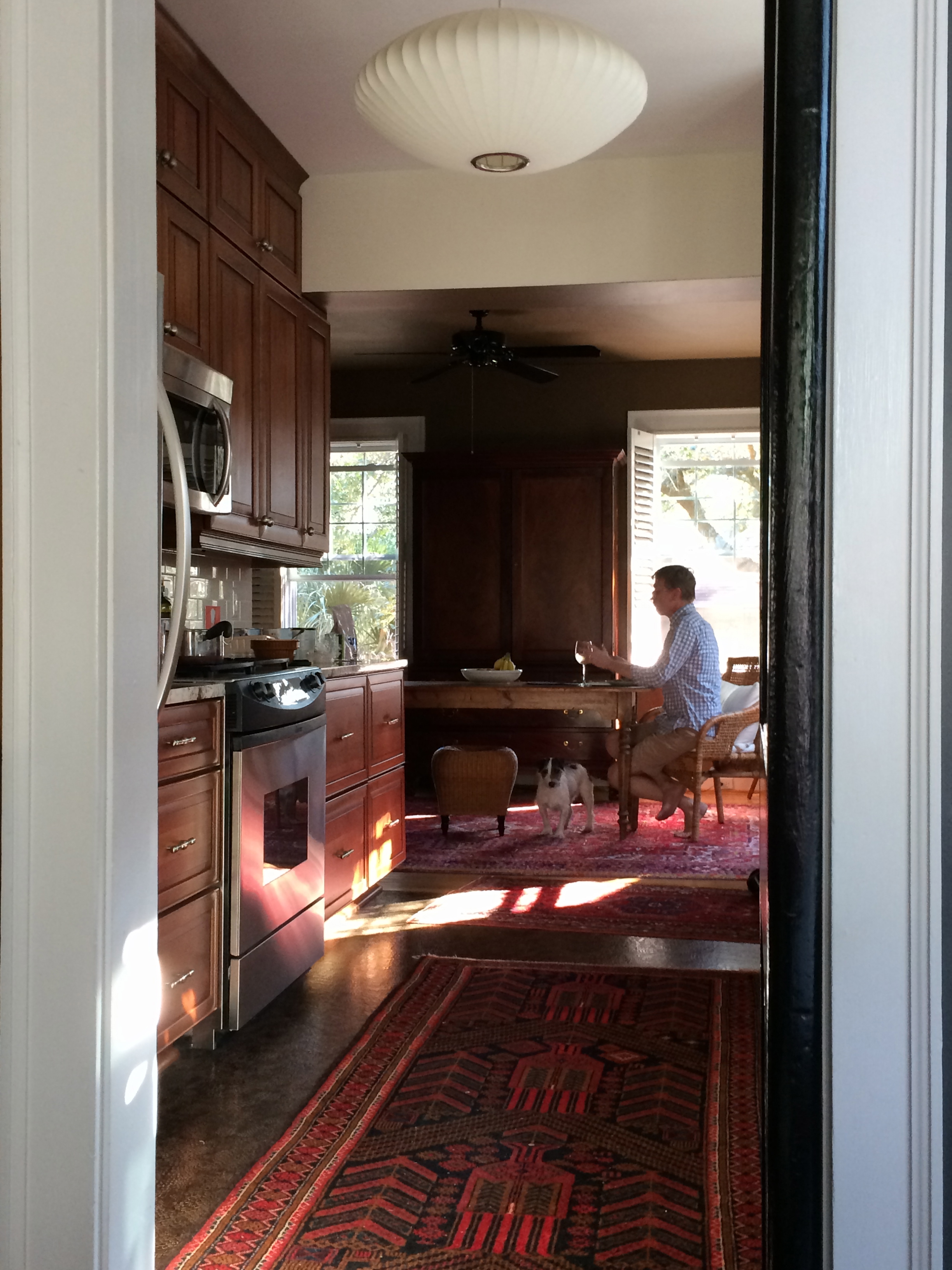 I took this photo the other night while I was in the study… after a week of having flu like symptoms (had a flu shot, so not sure what it was), I am still trying to come back to the land of the living. This day I couldn’t make it off the sofa, and food still doesn’t have any appeal whatsoever… whaaaat??!! Yeah, I know. One heck of a diet, ha ha… Anyway, thankful for my phone camera, I saw Fred sitting down to eat, Charlie underneath his feet, the light in the window, the wine glass… this looks perfectly staged, like in a magazine. I’m not here to say it always looks like this, ha ha… it doesn’t. I love this photo!