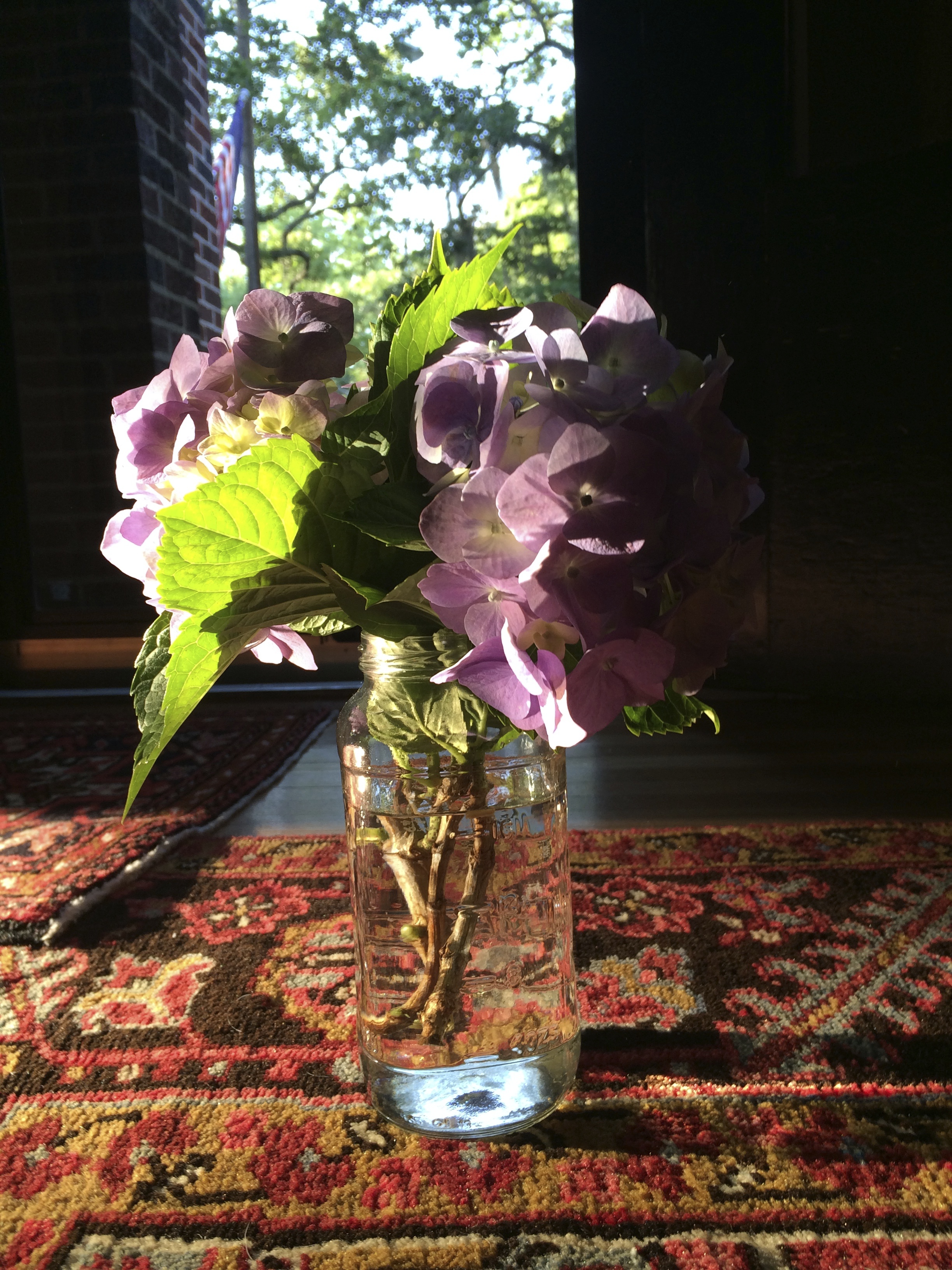 A funky set up for sure, but wanted to show you that our hydrangeas are in full bloom and they are gorgeous! Fred cut a few and we put them in this jar (they make the best vases, I swear!)… I have snapped photos of them all over the house in the late afternoon sunlight… hmmm, on the floor in front of the door? Perfect, different… gorgeous!