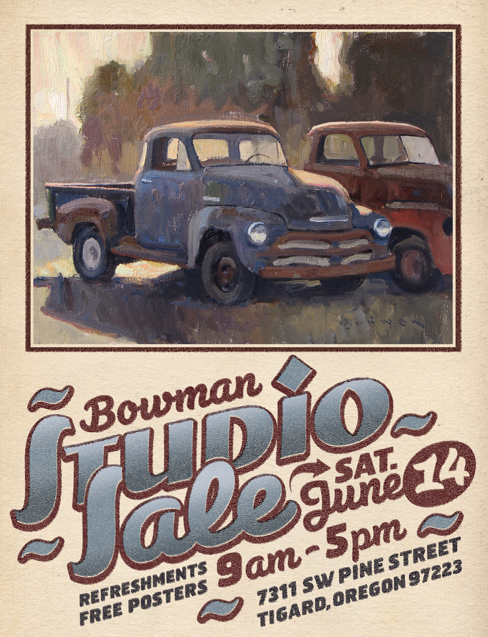 Where? Eric’s studio, located at 7311 SW Pine Street, Tigard, OR 97223