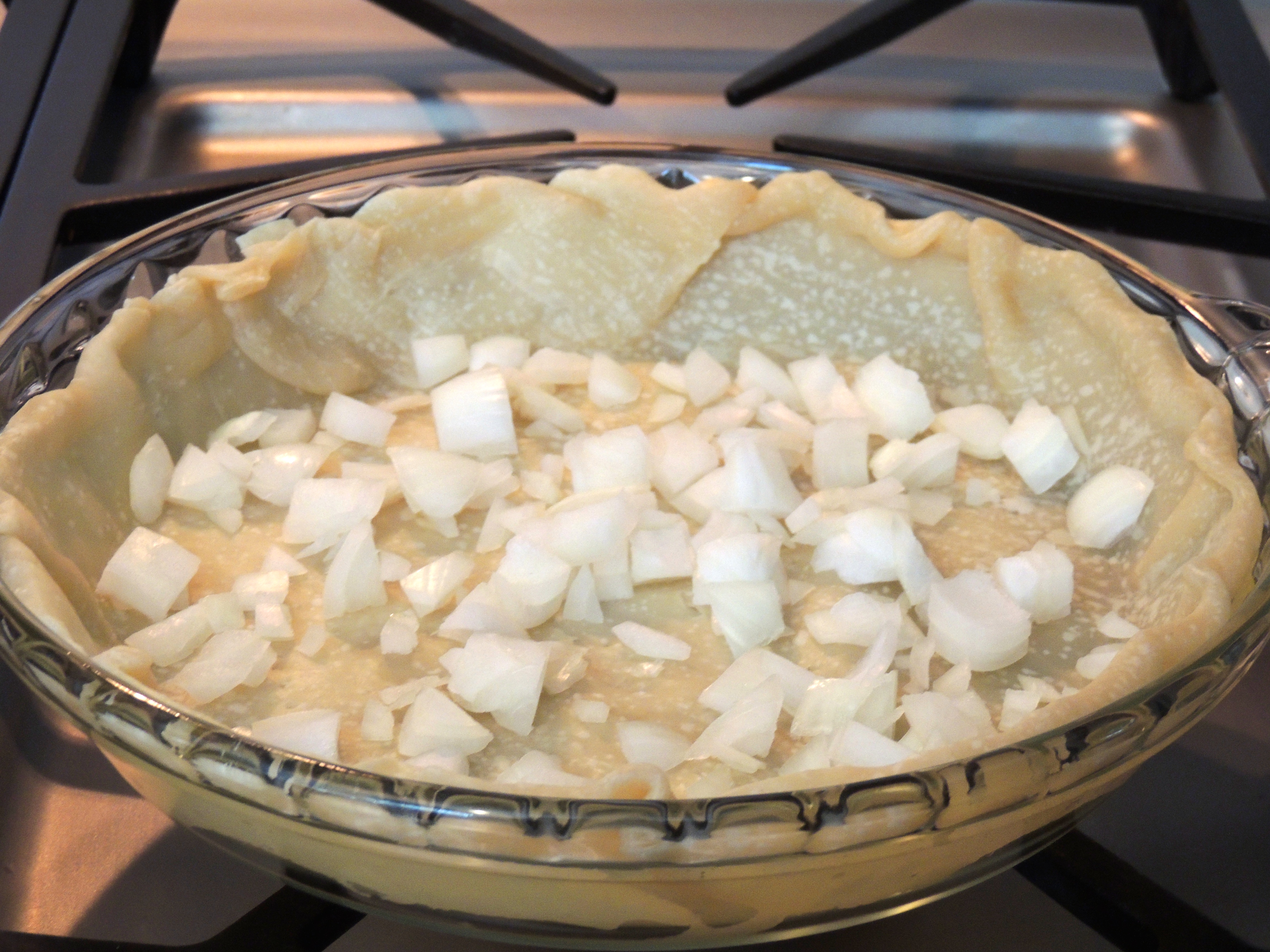 First bake the pie crust. I poked it with a fork a few times to prevent it from bubbling up, some people put beans or other pie weights to hold it down… Once it’s out of the oven, sprinkle the chopped onion in the bottom.