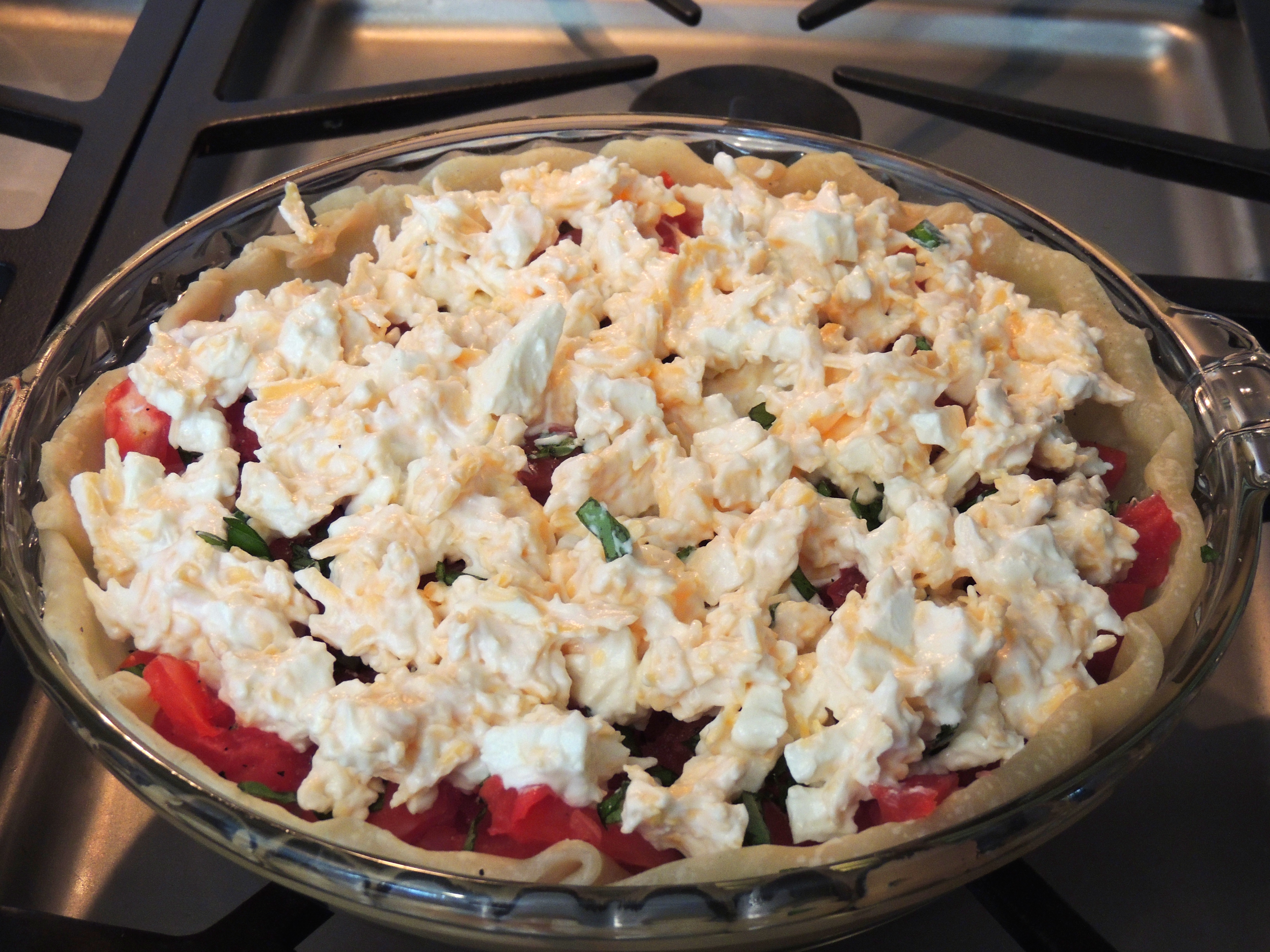 3 Sprinkle the bottom of the pre-cooked pie shell with chopped onion. Spread the chopped tomatoes over the onions. Sprinkle the sliced basil over the tomatoes.