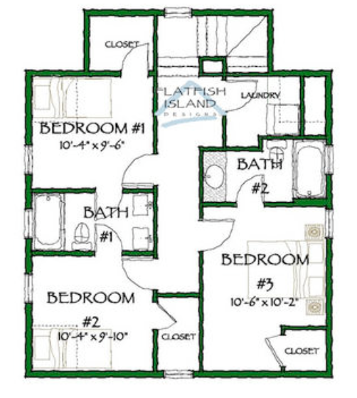 The upstairs has three bedrooms, two bathrooms and a laundry. For just Fred and I personally, I would try to have the laundry downstairs (stackable perhaps??) and one bathroom upstairs, maybe two guest rooms and storage! I love storage, ha ha! That’s the good thing about Flatfish Designs, they will work with you to make a plan work for you and your family. What’s not to love?