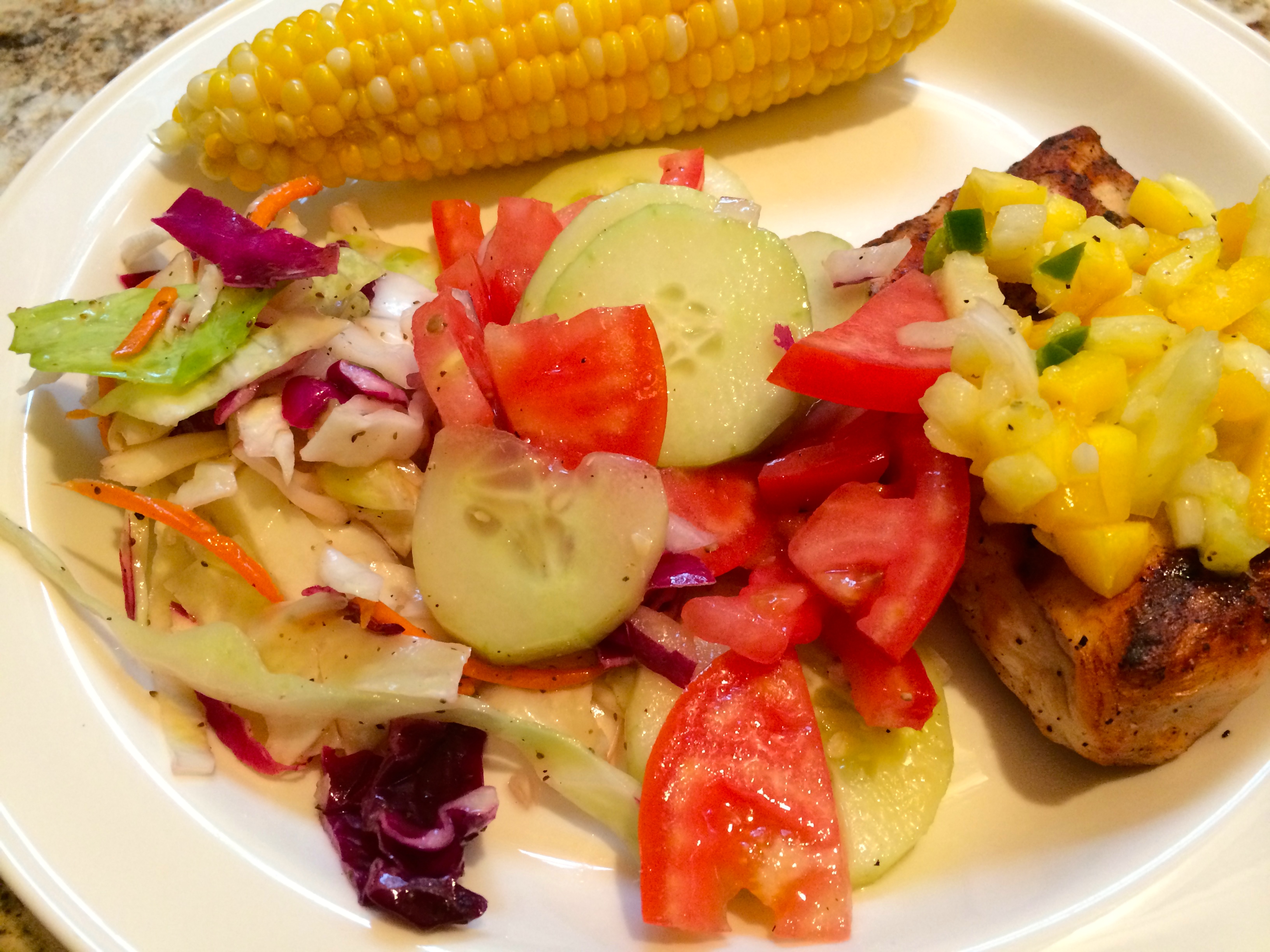 Summer is so good for fresh food, isn’t it? Do you take advantage of your local farmer’s market, or do you have a garden? Oooh, there is just nothing like fresh produce! This was a fabulous dinner, grilled chicken topped with a mango salsa, some great cucs and scrumptious tomatoes bedazzled with a little olive oil and vinegar… and some home made slaw… with vinegar instead of mayo, and for dessert… corn on the cob! Pretty isn’t it? Enjoy your summer time meals while you can!