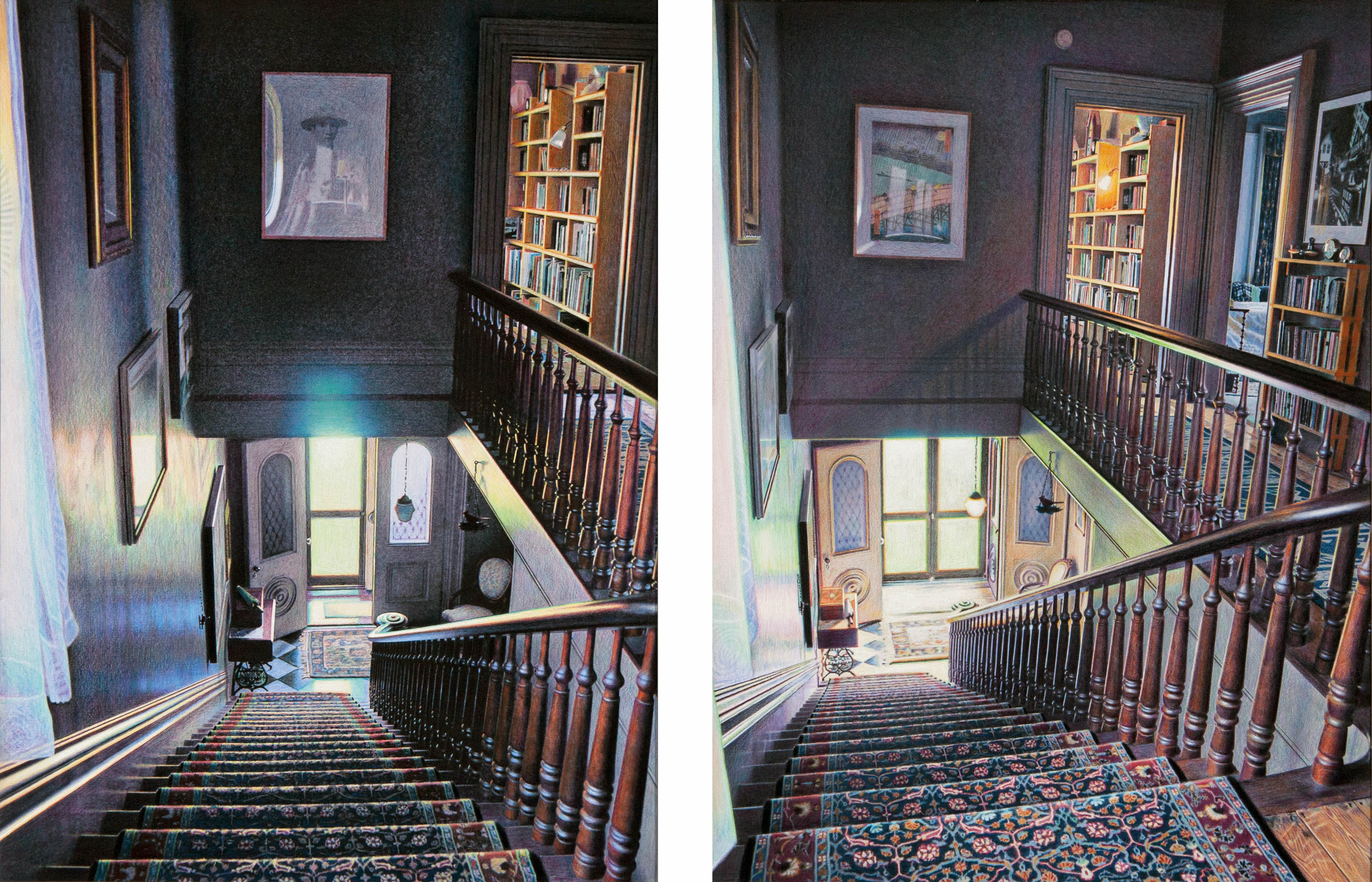 The work portrays sections of the interior of our house that I’ve spent the last seventeen years adjusting, a work of art in itself. (Reference: Against the Grain by J. K. Huysmans.) I’m actually drawing a place I’ve carefully created and arranged, so in a way, the image is generated twice. Each diptych is comprised of two panels of the same basic view altered only by the passage of time. What I find interesting is that the art itself can only exist in the viewer’s mind. It is the amalgamation or comparison of the two images that creates the specific emotion, not each individual panel. Gauging and balancing this convergence is everything.