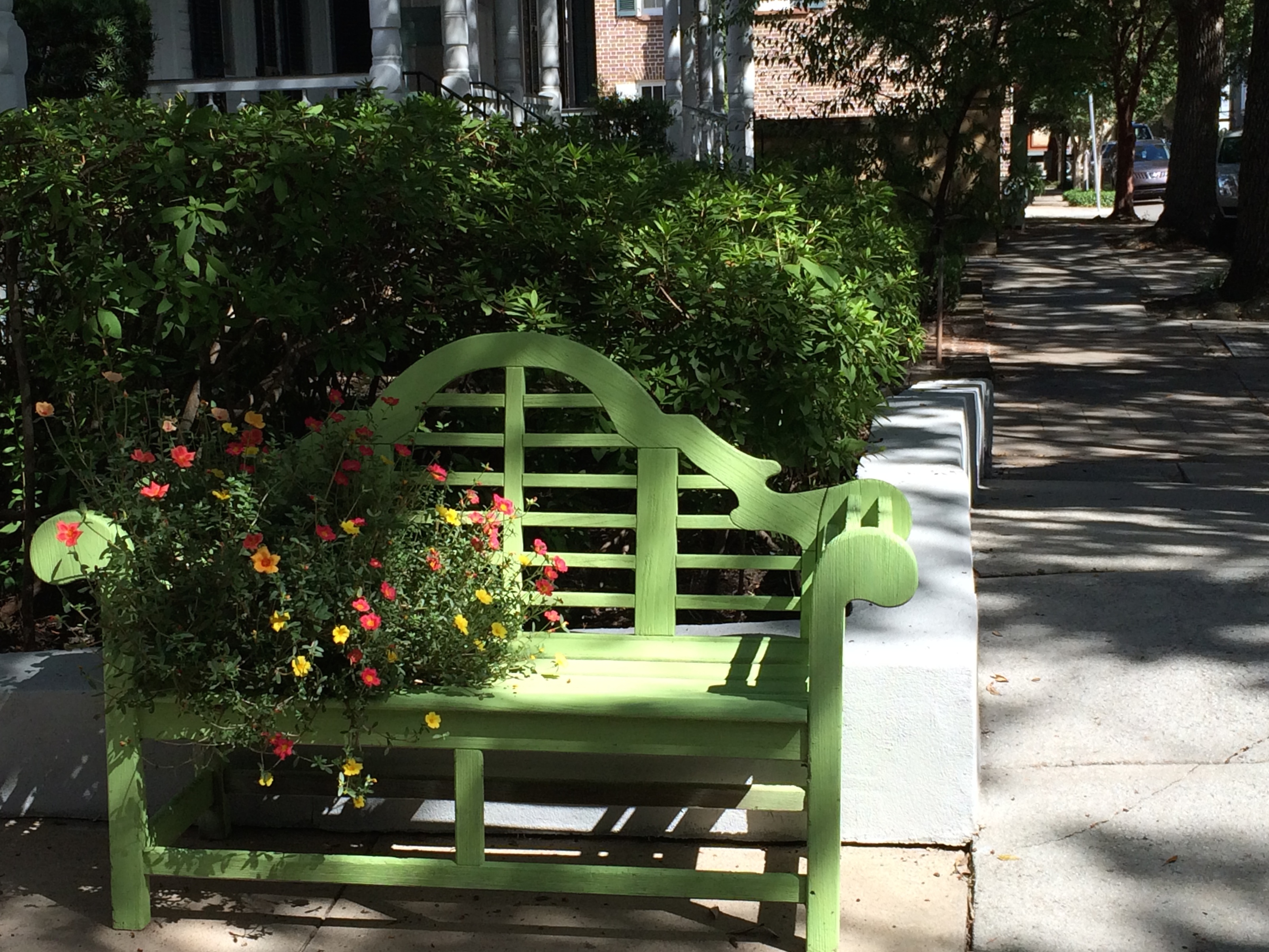 Charleston, SC – too cool. I love the old wonderful homes in the heart of the city. I was walking down the street the other day, and passed this happy green bench… I had to back up, set my bags down and snap a photo… I love the pretty flowers against that green – so inviting!