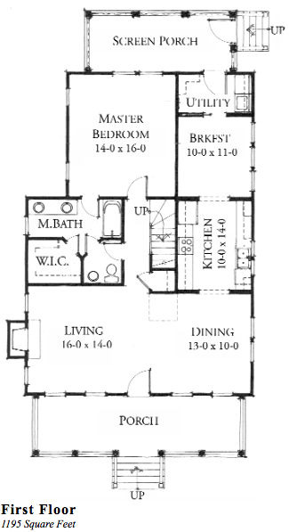 Here you see the front porch, and the back screened porch, allowing the gentle breeze to flow into your bedroom in the cooler months. What could be better? I love the layout of this plan with the open living and dining spaces, a very functional kitchen and breakfast area as well as a master bedroom/bathroom downstairs.