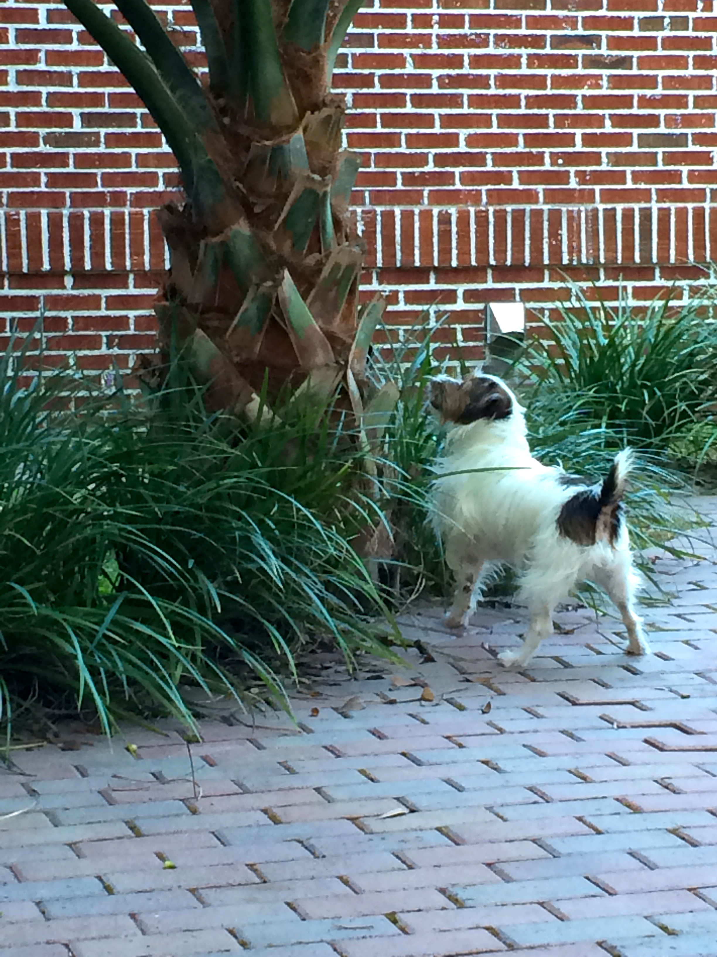 Charlie looking for his lizard friends… ahhhh, “the Lizzies” as I like to call them! At times he’s obsessed and wants nothing more than to play with the many lizards that lurk in the monkey grass and palms. Then he comes in, dirt in his mouth, purple plumbago flowers stuck to his sides – Oh Charlie! Life is good!