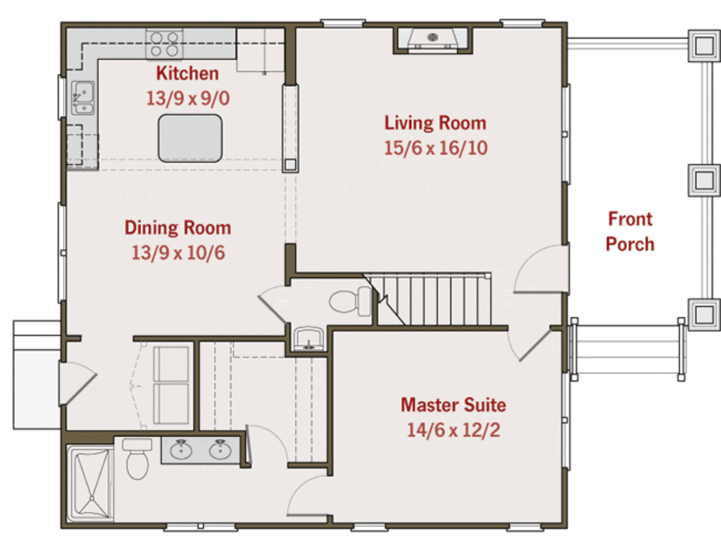 The main floor doesn’t have space that will go unused. Virtually every room in this house can become useful whether or not you have someone living in bedrooms. It’s nice how the kitchen, living, dining are all in close quarters. Since we aren’t big dining room people, I would borrow some of the dining room to use as the kitchen. Maybe extend the counter top into the dining room, then swivel the island in the kitchen (so it’s facing the living room), that way you would have plenty of room for barstools underneath it, it also leaves you enough room in the dining room maybe for a small table. It’s so smart that they took that space underneath the staircase and added a small powder room. Perfect for guests!