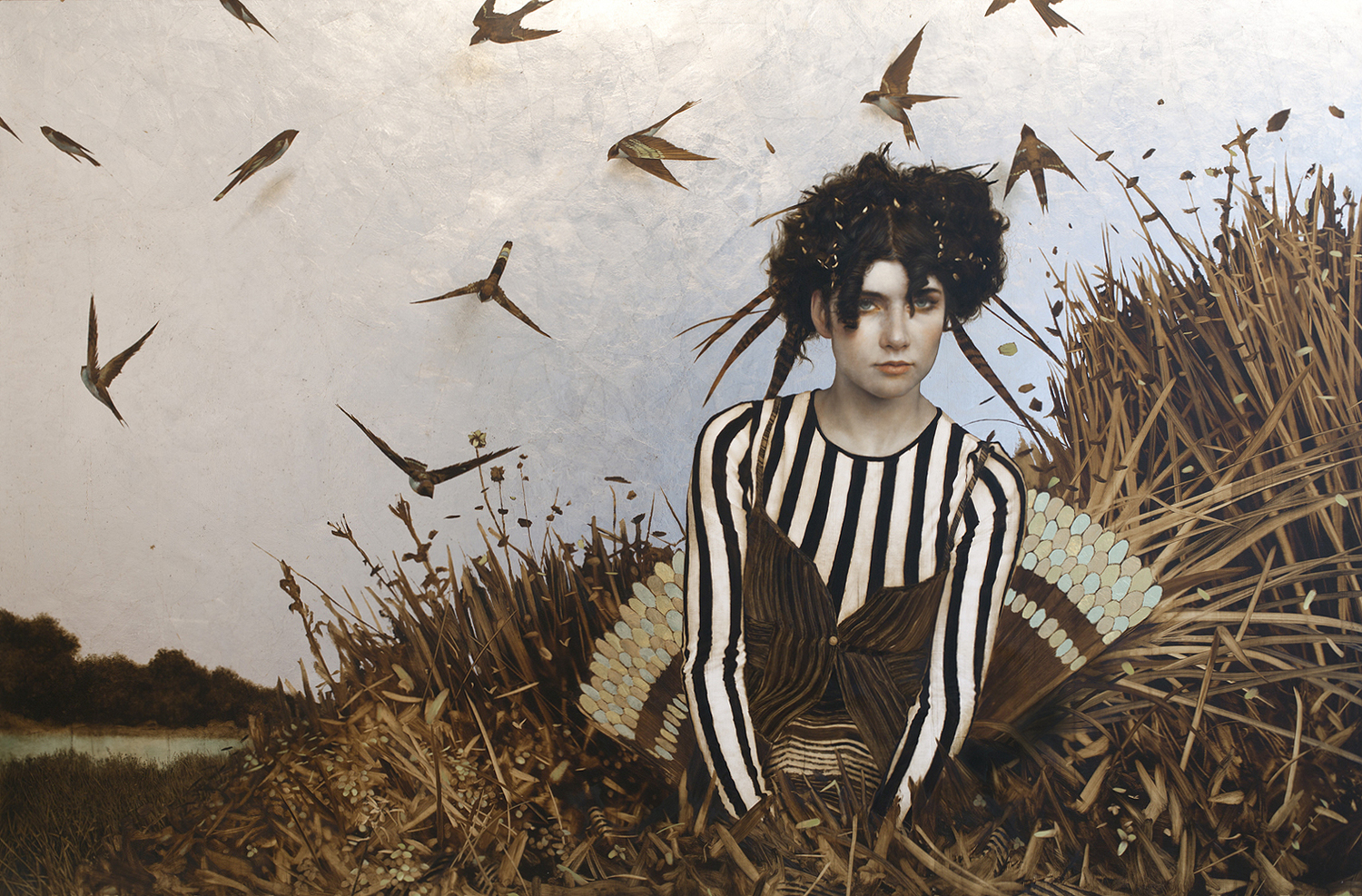 Brad’s paintings are so unique, stunning in every way. The way he captures his subject, gives it a twist and paints with oil, gold and silver! Just look at those birds! They appear three dimensional, don’t they? The woman looks as if she will stand up and walk right out of the painting! Check out some of Brad’s other paintings… Wow. Wow. Wow!