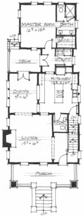 This plan has a nice size kitchen and dining room with french doors that head out to a deck, how nice for when the weather is beautiful! I like that there is a downstairs Master Bedroom/Bathroom with a Utility room close by.