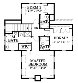 The upstairs shows the Master in front with a Master Bath, and two Bedrooms each with their own Bathrooms.