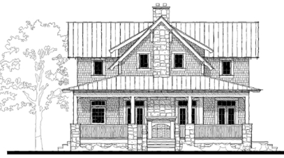 What a statement! Just look at that entrance. WOW! It’s hard to tell from this drawing but you’ll see a link in this post so that you can see actual images of a real house, interior and exterior. Fabulous porch, wonderful cuts in the roof that add so much charm and character!