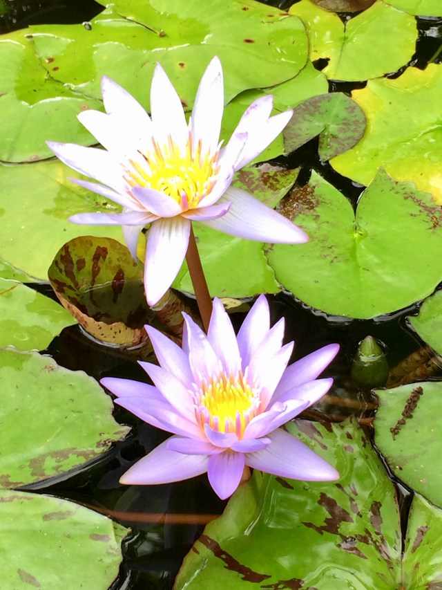 I took a photo of some Water Lilies while visiting a local garden center/nursery. Ah, they have beautiful flowers and plants. There is usually someone directing traffic in and out it’s that crazy. It was a very bright day, so no filter was used on this photo, the flowers don’t look real. The lily pads do, but not the flowers. It was stunning!