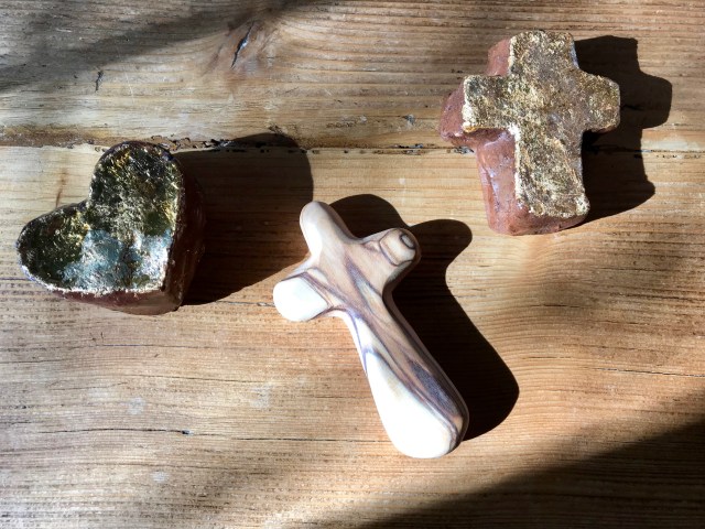 Barbara Biel creates the most amazing hearts and crosses. No two are exactly the same. They are so special. We have bought them as gifts throughout the years but never bought one for ourselves. Thanksgiving we bought the cross, and I bought the heart this year for Fred for Christmas. They have larger of both that are amazing, but the small ones are magnificent and look so dramatic in the sun, don’t they?