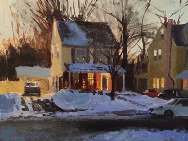 Joseph Gyurcsak. An artist from New Jersey – who captured this painting On Grayson After Grayson so well. He painted this scene on Grayson Avenue after that wild snowstorm “Grayson” blew through. Love the lights and the trees. Adds so much character!