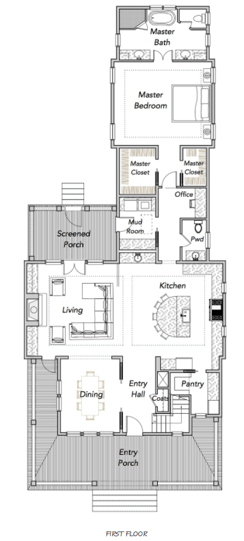What a great plan! Upon entering this home you walk into an entry hall, which is such a nice detail, the stairs are on your right and there is a coat closet. To your left is the Dining room (which always gives you the option to make it a Library – or Office/other useful space – if you don’t need a full dining room space) – The Kitchen!! Wow! Since there aren’t a lot of us here, I would opt for a regular rectangular island giving more space in the Kitchen and OH! THERE IS A PANTRY! A very nice pantry – that’s a huge plus in my book! The Kitchen looks into the Living space which is always nice. Located off the Living area is a Screened Porch – woohoo! When the weather warms up you can open those doors and let the breeze in minus the mosquitoes! There is entry off the Screened Porch into a Mudroom – a small Office space and a Powder room. An exquisite Master Suite is located in the back of the house (complete with 2 Master Closets!) – Oh, what a dream!