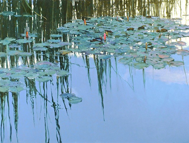 Between the bits of light towards the top, the reflections of the clouds mid point and the reflections near the bottom this keeps my eye in the painting. Also love those little bits of color from the blooms about to emerge.