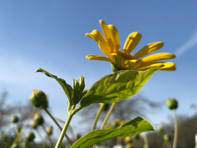 I love this photo… it screams to me “OH HAPPY DAY!” – You can feel the sunshine in an almost flawless sky. The bright green of the leaves against the sunshine yellow flower. You’ll never guess where I took this photo…