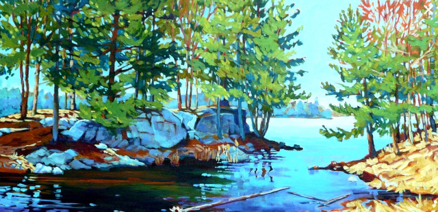 My paintings are the reflection of my fascination with the interaction between light, colour and pattern in water and landscape. Because of the many layers of design and colour found in water, the possibilities are endless. I paint landscapes, but I always come back to water.