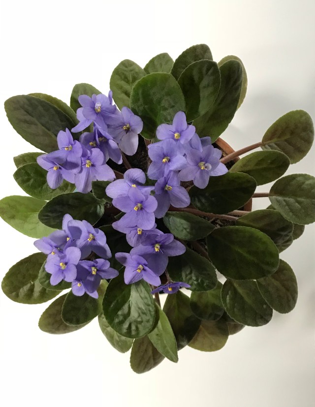 A few things – Violets do not like pots that are too big – I’ve read that the pot should be 1/3 the size of the leaf span (diameter). So if your leaf span is 9″, that’s a 3″ pot. Mine was getting root bound so it’s in a larger pot now and still excelling, the pot is still at least 1/2 or more the size of the span of the leaves.