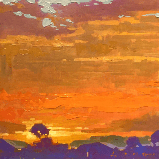 Chris Long. Pretty amazing, right? Just look at the texture in the sky. Some of his paintings have such fabulous texture (see Oregon Coast, another fabulous example). The colors in this painting just grabbed me – The sky exudes such radiant heat and the cool horizon color is just fabulous against that brilliant sky! I featured Chris a little over a year ago – thought it was time for a re-feature!