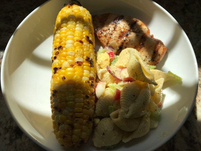 Grilled chicken and corn with a side of macaroni salad… A quick and easy dinner is ideal on a warm day, especially when the most time consuming part of it (macaroni salad) can be made in the morning.