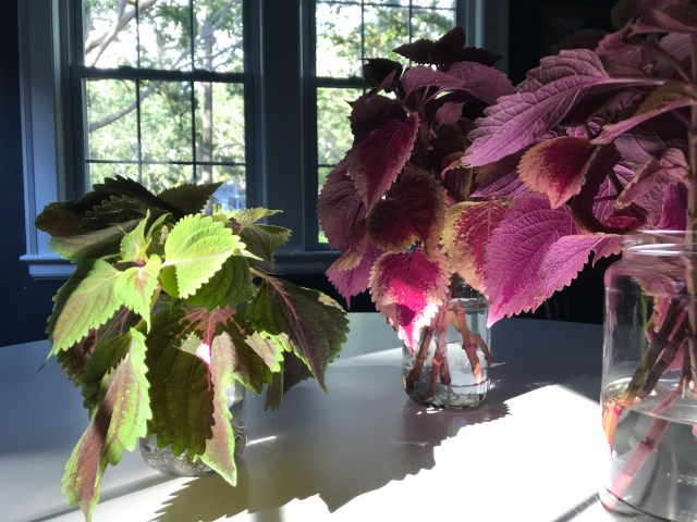 Several years ago a sweet neighbor gave me some coleus cuttings that she had rooted (is that the proper terminology?) – we planted the small cuttings and they THRIVED. I don’t mean they did well, they WERE AMAZING, they grew to be quite large and were stunning all season. I bought one coleus plant this year, a small one – it grew quickly and was stunning – as soon as there were pieces large enough to clip to root, I did so, as one pot was tiring we had another on it’s way to being just as magnificent!