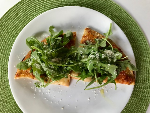Sometimes we need a quick lunch idea. Something fairly light and healthy without being too full of fat and calories. Have you tried American Flatbread Pizza (frozen section)? It’s good! It’s handmade thin & crispy pizza that’s baked in a wood fired oven. We buy the cheese & herb pizza, it’s very thin and bakes up in just a few minutes. As soon as it comes out of the oven I top it with arugula, a thin drizzle of EVOO and a tiny sprinkle of parmesan. It’s like pizza and a salad all in one! A great time saver!