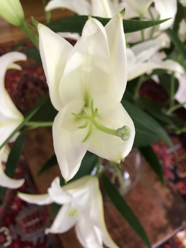 Lilies. I love them. They have the most wonderful scent ever! We usually buy 4 stems, and they last about 2 weeks. I usually try to find a few stems that have blooms that have not opened so they will last longer. This is what I do: