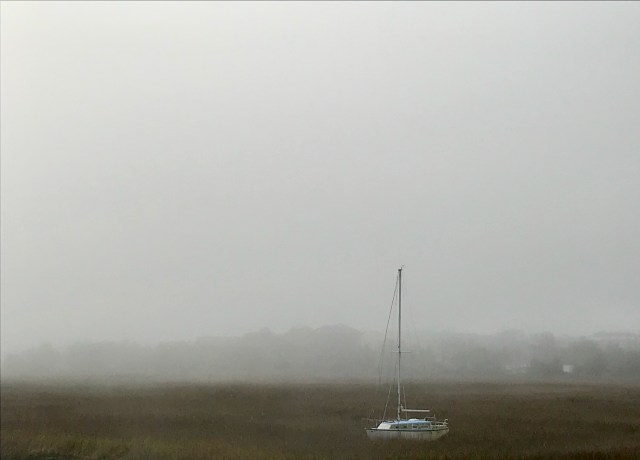 I snapped this photo while we were on our way into downtown Charleston – heading over the Ashley River Bridge. This boat has been in the marsh grass for some time, but I finally snapped a photo (hard to get because of traffic) – no sunlight, but fog, and it was pretty heavy on this particular morning.