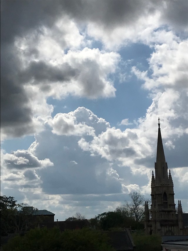 We were on our way downtown (Charleston, SC) – parked in a garage (headed to Apple) and on our way out of the garage I noticed the view was so amazing. Took a quick pic. There are steeples all over Charleston, SC. The lighting wasn’t the best to capture the steeple, but I like the darkness and how it highlights the outline of the church steeple. The clouds were VERY dramatic. Beautiful views are everywhere you look!