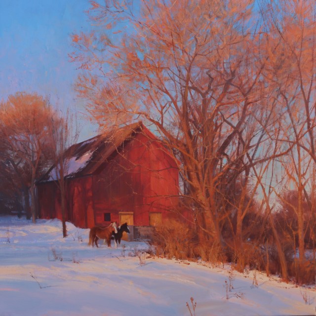 Michael Albrechtsen. His website has one beautiful painting after another, but Wait for Spring jumped out at me – the magical light and the beautiful red color depicted on the barn – the colors in the snow… and the stunning trees. Every component in this painting is perfection.