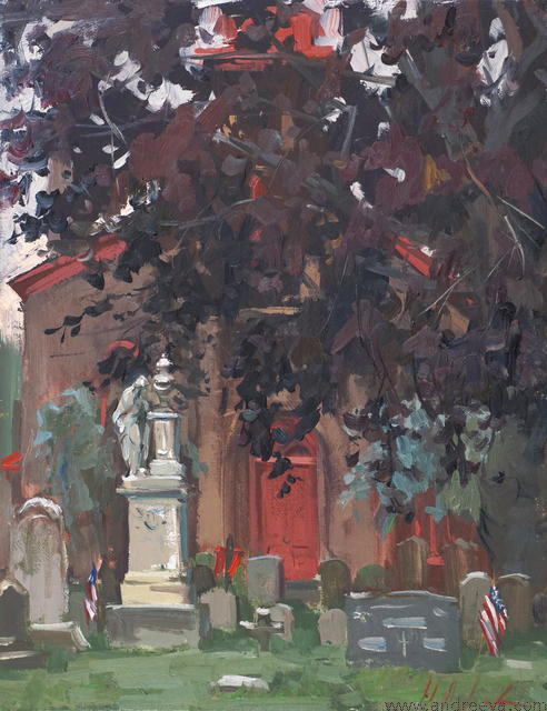 What a wonderful painting “Memento Mori” – the church is fabulous and I love the tree overhanging… and the flags. Very special.