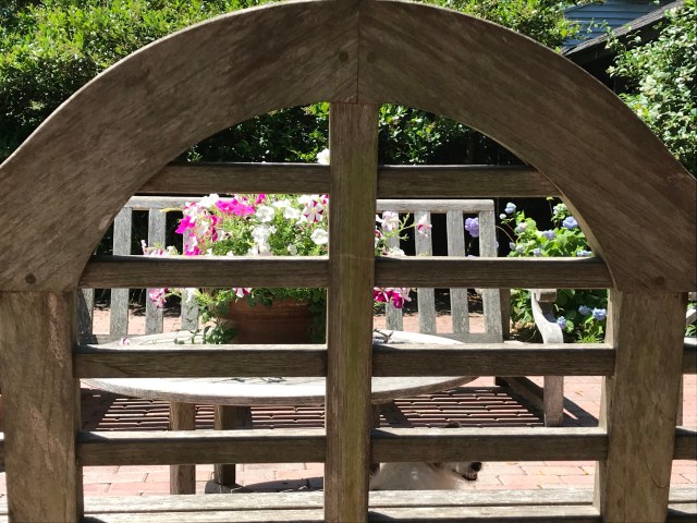 This is a peek through the slats in a bench in the backyard. You can see in the background that the lagustrums have stopped blooming (heavy sigh), but the Confederate Jasmine (on right) is still going strong, as are the Hydrangeas and Petunias. Charlie has found a shady spot underneath the table. Smart dog!