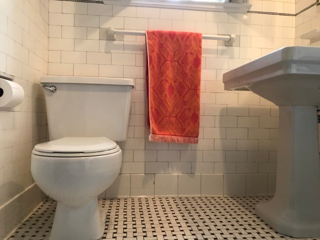 This image makes me laugh. One of the first things our contractor mentioned after he saw the bathroom is that the toilet would have to be moved over a bit (towards the sink) because it was jammed up against the wall, where it wouldn’t meet code. What?? I couldn’t believe that I never noticed, haha. After talking about it we decided to turn the toilet to face the sink area. It always bothered me that the toilet wasn’t on a proper wall, the blinds and the window partially above it. It seemed almost like an afterthought, now that I think about it. The bathroom is in remarkable condition considering someone has lived here since 1931! Toilet, sink, tub, floor/wall tile are all original. As are the towel racks and built in toilet paper holder, soap dish, etc. Charm…