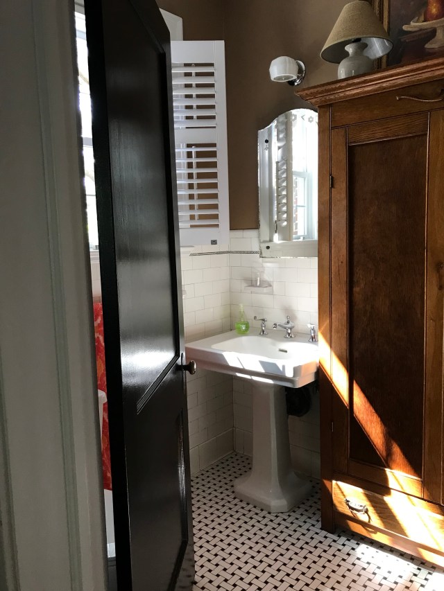 Most of the homes built around this area were built in the 1930-40’s. Many have the basketweave tile on the floors and subway tile on the walls. This bathroom gets beautiful light throughout the day. The armoire was a necessity because there wasn’t anywhere to store anything other than the medicine cabinet. We added the plantation shutters at one point and painted all of our doors black, which I love!