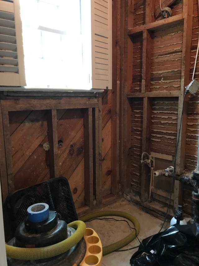 Our contractor introduced us to the two men that would be demoing the bathroom. The first thing they ask: Is there anything you want to save? Yes! The pedestal sink, plantation shutter and the trim around the door (that originally went into a bedroom) in case it’s needed for something…