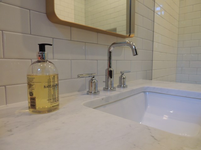 The vanity turned out amazing and I LOVE the brass hardware! We have the same hardware in the kitchen, it’s a smaller size. This is a small area so I thought the larger hardware would make it sing. 🎶 The drawers have the easy glide close (not sure the proper terminology) – and the drawers hold plenty!  The marble is stunning (vanity and floor), and I cannot tell you how good it feels under foot. It’s honed, so it’s not shiny, the feel isn’t like the basketweave tile that we used to have (which is about 40 degrees any time of year), the marble is comfortable to stand on.