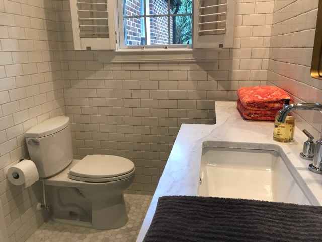 The toilet in it’s new location on the opposite wall. It used to be underneath the shutter on the left which seemed odd. We never noticed how jammed up to the wall it was. Hilarious! I believe the only thing we kept are the Plantation Shutters and they fit the look beautifully!